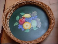 Bandeja circular de mimbre con dibujos pintados a mano. Capacidad para confeccionar 50 bandejas mensuales.