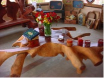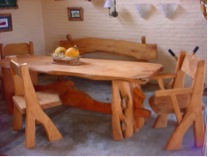 Juego de mesa y cocina, estilo country, realizado con maderas respetando su entramado natural, lo cual genera un relieve discontinuo y muy natural.